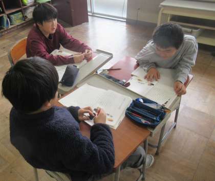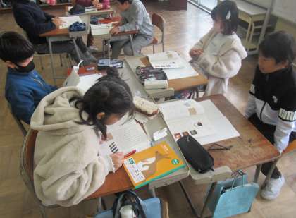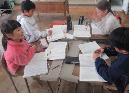 国語では、「未来へつなぐ工芸品」の説明文を読み、段落ごとに文章を要約する学習をしました。 要約のためのテンプレートを使い、大事なキーワードを班で協力して穴埋めすることで、筆者の伝えたいことをとらえることができました。