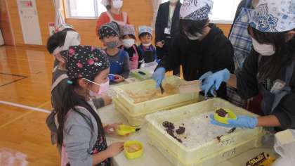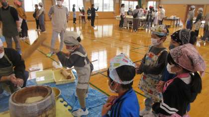 学習参観では、「いろいろなおと 見つけたい!」と題し、一つの楽器から聞こえる音を感じ合いました。5時間目、餅つきでは、大きい杵を持ち上げ力強くついていました。「疲れたけど楽しかったよ」と、貴重な経験になったようです。教室に戻ってきなこ餅とあんこ餅を堪能していました。
