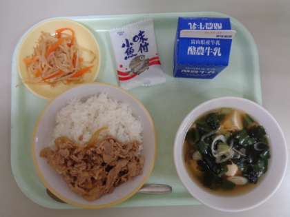 今日の献立は、ごはん、焼き肉丼、ナムル、中華スープ、味付け小魚、