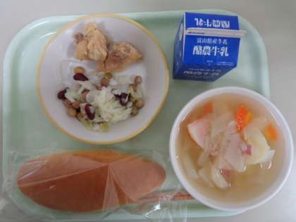 ミックスビーンズのマリネ、野菜のスープ煮、牛乳 です。