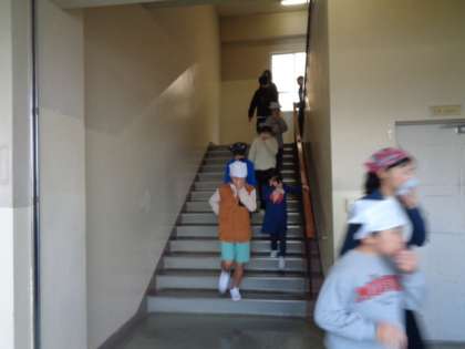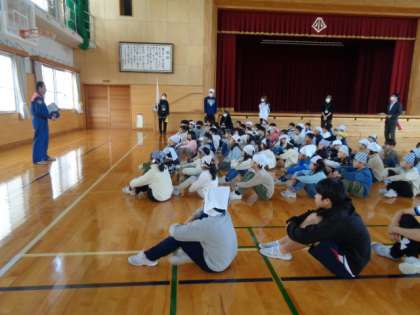 今月の避難訓練は、清掃時間に行いました。高学年の子供たちは、下級生に指示を出し、みんなで体育館に避難しました。その様子を消防署の方に見ていただきました。