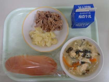 今日の献立は、コッペパン、豚肉の甘辛煮、こふきいも、