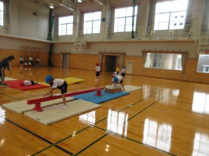 マット運動遊びの学習を終えました。様々な動物歩きを行ったり、いろいろな方向に転がったり、手や背中で支えて逆立ちをしたりして学習を進めてきました。様々な動きのポイントを動画で確認したり、友達と見合ったりして学習をしました。「背中を丸めたらできた」「手のひらをしっかりマットにつくようにしたらまっすぐ回れた」などポイントをしっかり考えて取り組むことで、自分の力が伸びていくことを実感していました。