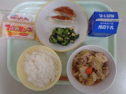 今日の献立は、ごはん、焼きぎょうざ、コーン和え、韓国風すきやき、