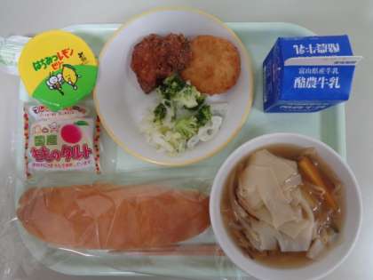 今日の献立は、コッペパン、豚肉の米粉揚げまたはえびカツ、そえ野菜、