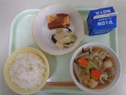 今日の献立は、ごはん、揚げ出し豆腐のごまだれかけ、かぶの色どり、