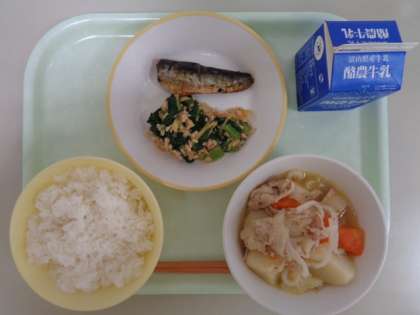 今日の献立は、ごはん、いわしの土佐煮、納豆和え、塩肉じゃが、牛乳