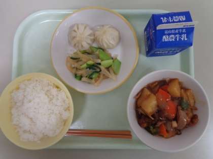 今日の献立は、ごはん、えびパオツ、大根のナムル、酢豚、牛乳 です。