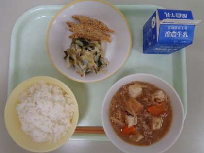 今日の献立は、ごはん、きびなごのさくさく揚げ、海藻サラダ、