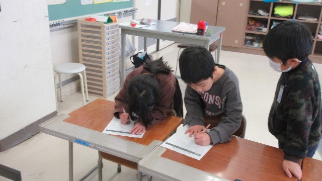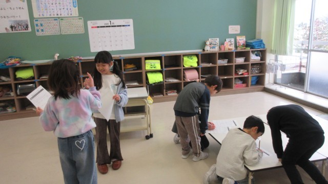 学活の時間には一人一人が3学期に頑張りたいことを考え、めあてを立てました。その後、友達と冬休みにしたことを質問し合う「冬休みビンゴ」を楽しみました。「僕も初詣に行ったよ」「お雑煮がおいしかったよ」等、冬休みに楽しかったことを友達に伝えていました。また、ビンゴの欄に友達からサインをもらってとても嬉しそうでした。