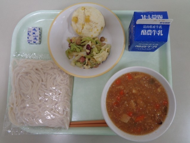 今日の献立は、ソフト麺、ソフト麺の肉みそ、蒸しパン、ビーンズサラダ、ポケットチーズ、牛乳 です。