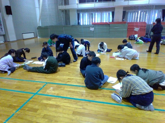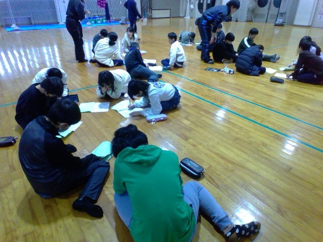 昼食前に、楽しかった活動を班ごとに振り返っています。自分たちのがんばりをたくさん発見できるといいですね。