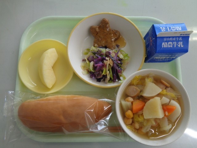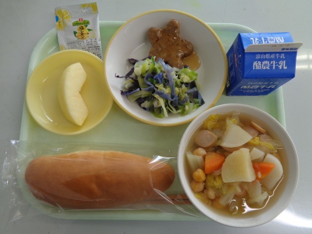 今日の献立は、コッペパン、星形ハンバーグ、サイエンスサラダ、根茎葉のポトフ、りんご、牛乳 です。