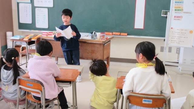 新1年生との交流会に向けて、2年生に園児役になってもらい練習をしました。緊張していた様子でしたが、「インタビューで言ったことに返事をしていていいと思いました」「ゲームが楽しそうでした」等、いいところを伝えてもらいました。アドバイスもたくさんもらい、本番に向けてやる気が高まっていました。