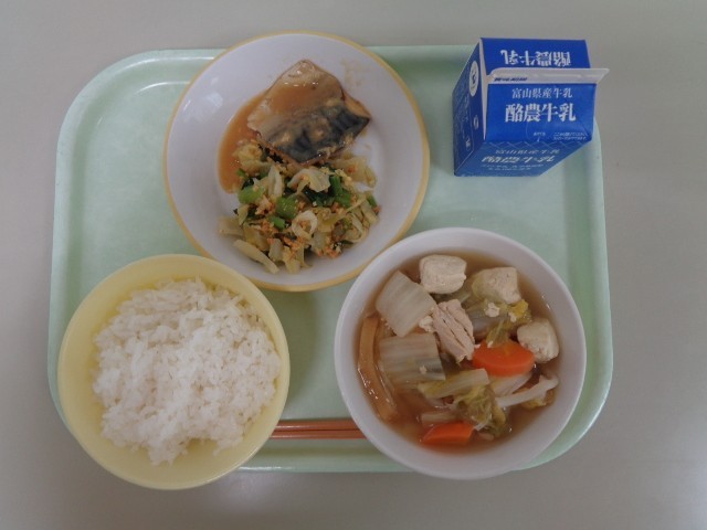 今日の献立は、ごはん、さばのみそ煮、炒り大豆和え、ちゃんこ鍋、牛乳 です。