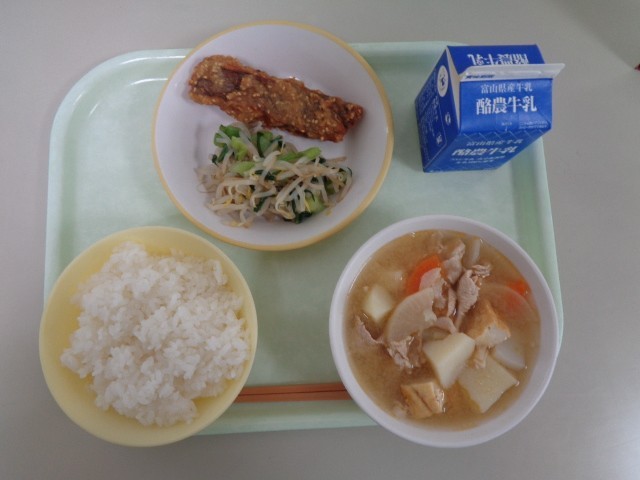 今日の献立は、ごはん、ホキの利休揚げ、もやしのおひたし、豚汁、牛乳 です。