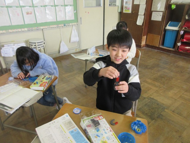 理科では、磁石について学習しています。今回は、磁石について知っていることや、実際に触ってみて知りたいことや調べたいことを考える学習でした。