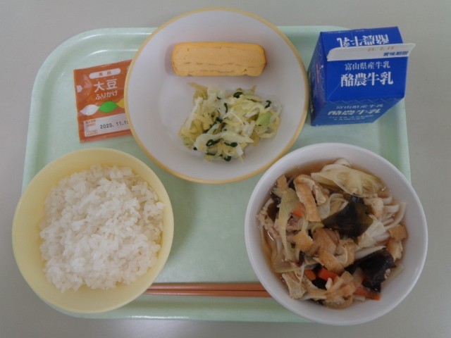 今日の献立は、ごはん、厚焼き卵、あわせ和え、五目うどん、大豆ふりかけ、牛乳 です。