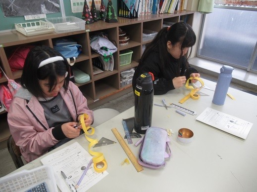缶やおぼん、タンバリンやのりなど、紙テープを使って調べ、円周率が約3.14だということを実感していました。