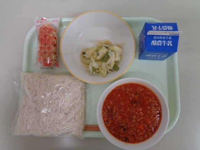 今日の給食は、ソフト麺のミートソースかけ、チーズドック、アスパラサラダ、牛乳 です。