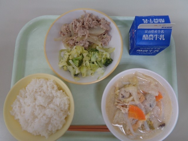 今日の献立は、ごはん、豚肉の塩こうじ炒め、そえ野菜、ごま豆乳鍋、牛乳 です。