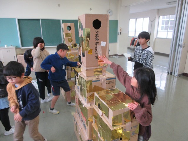 生活委員会が作った八幡城の土台に、みんなで金色の折り紙を貼って飾り付けをしました。