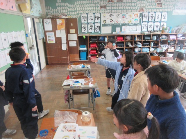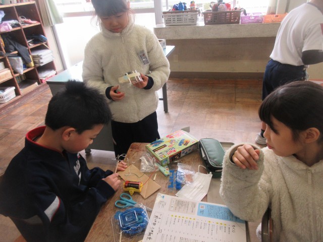 理科の学習のまとめとして、おもちゃをつくりました。これまで学習した「風とゴム」「音」「電気」「磁石」の力や性質を用いたおもちゃです。