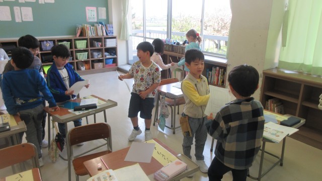 「どうぞよろしく」の学習では、自分の名前を書いた名刺を見せて、自己紹介をしました。紹介をしたら友達からサインをもらい、うれしそうにしていました。たくさん友達をつくることができました。