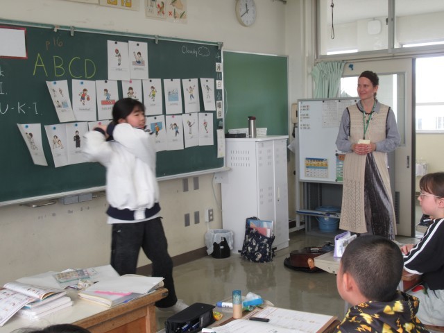 外国語での言い方を学習しただけでなく、ジェスチャーゲームをして好きなスポーツを伝えました。