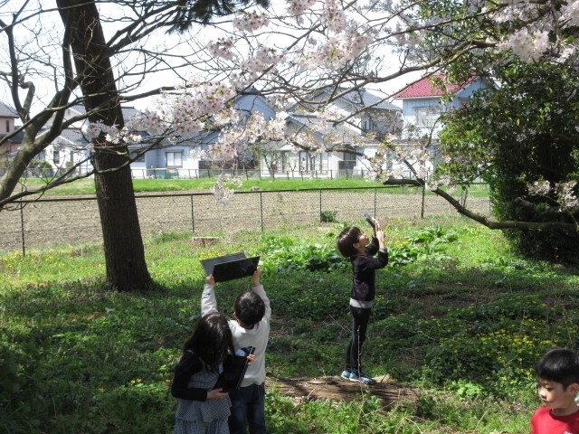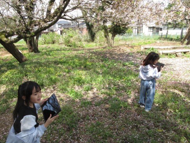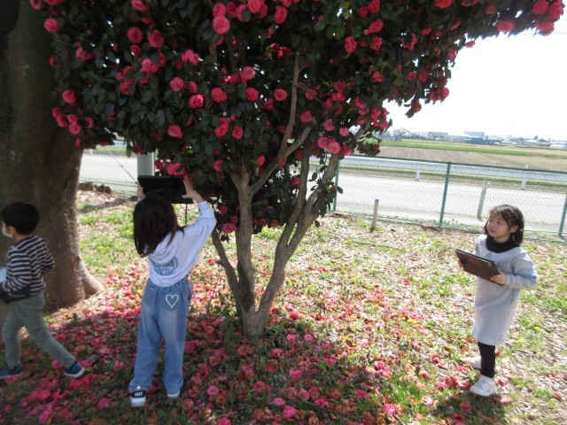 生活科では、学校の校舎裏や八幡の森などを写真で撮り、どんな春のものがあるのか探検をしました。