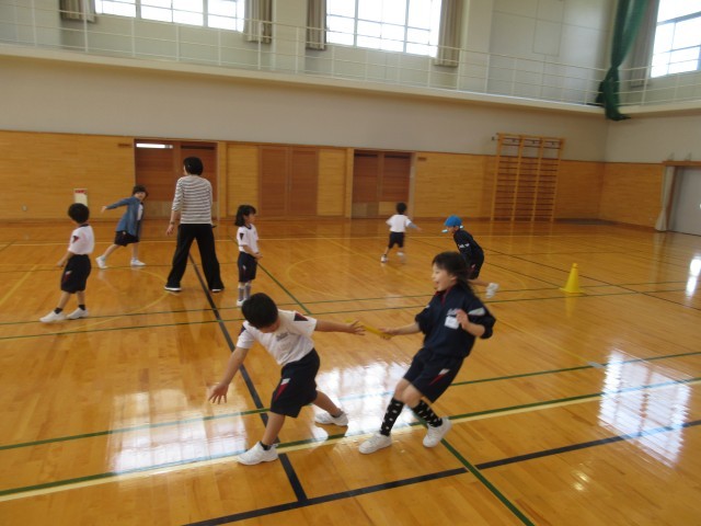 自己紹介の後は、走り出すときの姿勢を練習したり、どちらの足を先に踏み出すか確認をしたり、バトンパスのもらい方や渡し方の練習をしたりするなど、基本的な動きを確認しました。