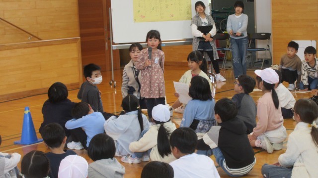 はちまんタイムに、入学おめでとう集会がありました。1年生は、全校の前で自分の名前、好きな〇〇、好きなわけを話しました。何度も練習したおかげで、上手に自己紹介することができました。全校のみんなに祝ってもらい、とてもうれしそうでした。