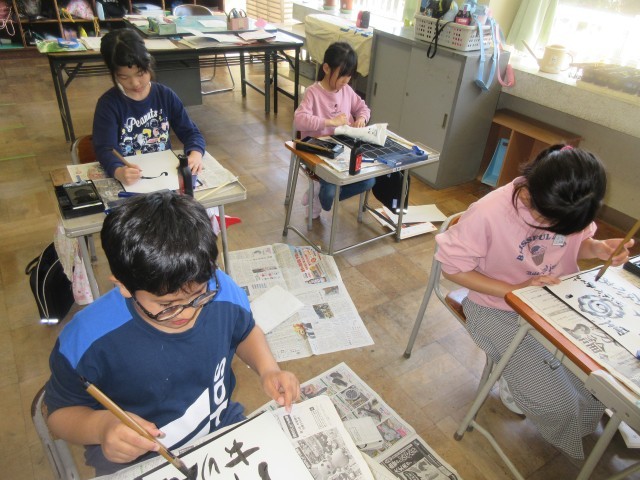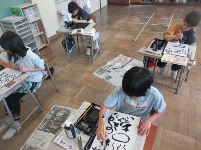 3年生の子供達にとって、初めての毛筆の学習! 細い線、太い線。くねくね、うずまき・・・色々な線や文字を試し書きし、毛筆に慣れ親しみました。