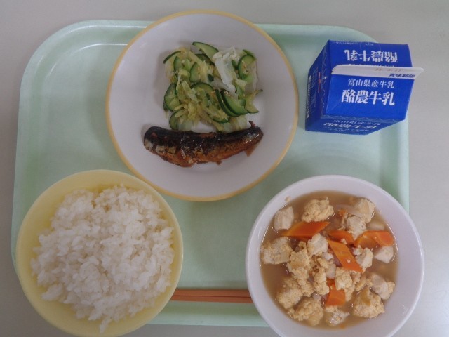 今日の献立は、ごはん、いわしの生姜味、あわせ和え、豆腐の錦とじ、牛乳 です。