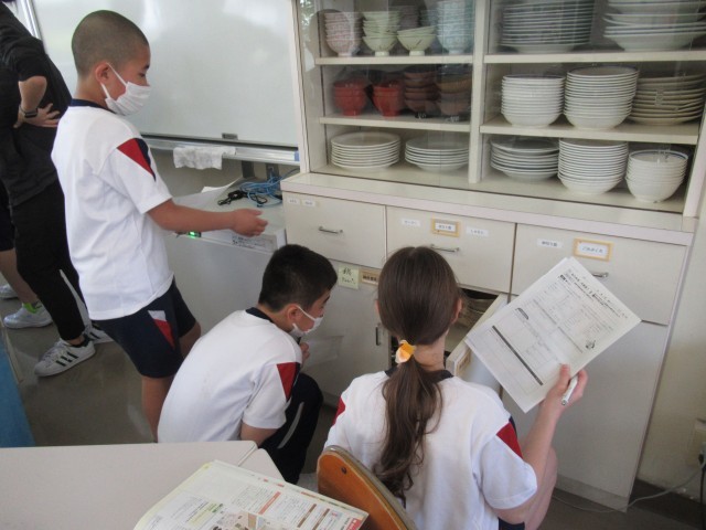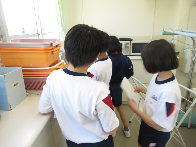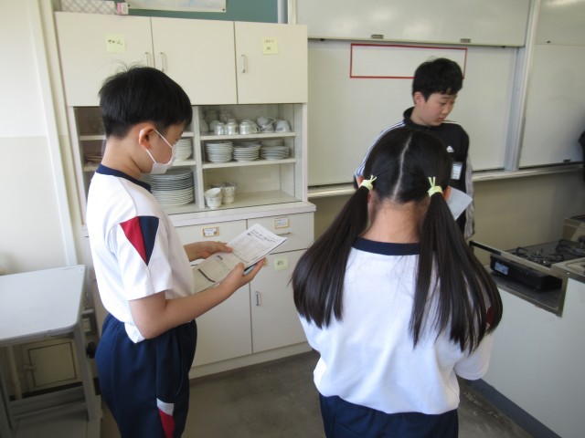 実習をするので、家庭科室にあるものを確認する学習をしました。