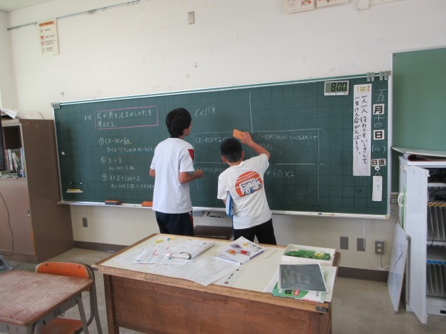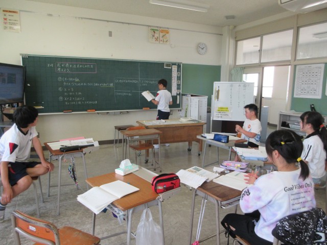 算数では、文字を使った式を学習しています。自分で考えた場面を式に表して発表し、みんなでどんな場面か考えました。