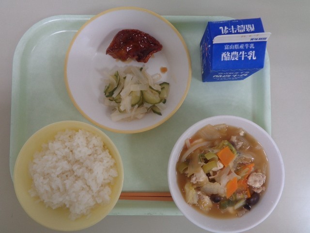 今日の献立は、ごはん、赤魚の照り焼き、酢の物、肉豆腐、牛乳 です。