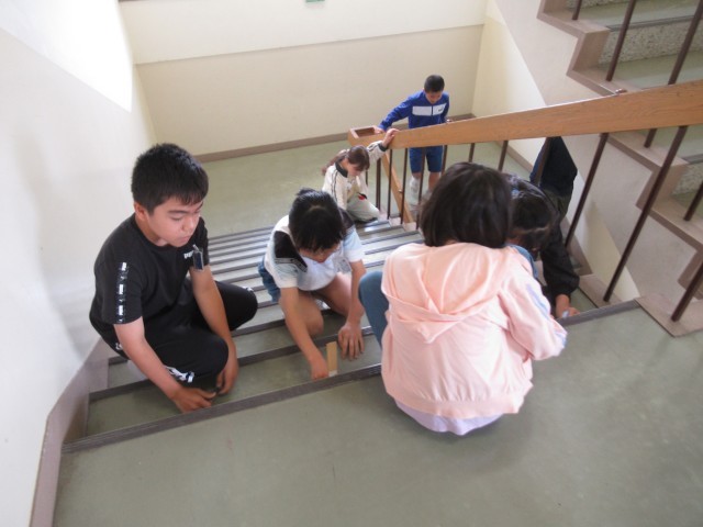 算数科では、比例の学習のまとめをしました。学習したことを通して、学校の1階の床から3階の床までの高さを求めました。