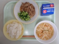 今日の献立は、ごはん、厚焼き卵、青菜のごま和え、関東だき、牛乳 です。