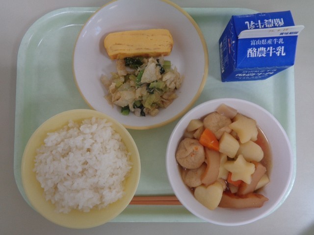 今日の献立は、ごはん、厚焼き卵、青菜のごま和え、関東だき、牛乳 です。
