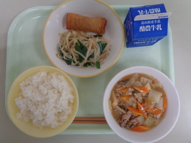 今日の献立は、ごはん、春巻き、塩ナムル、八宝菜、牛乳 です。