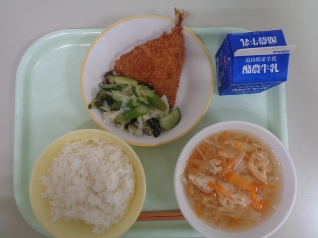 今日の献立は、ごはん、あじフライ、海藻サラダ、みそ汁、牛乳 です。