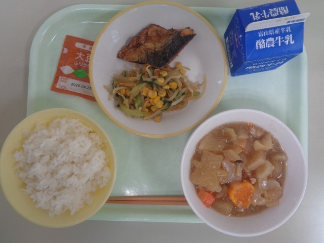 今日の献立は、ごはん、さばの塩焼き、チンゲンサイソテー、鶏肉と根菜のごま煮、大豆ふりかけ、牛乳 です。