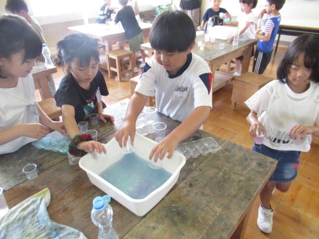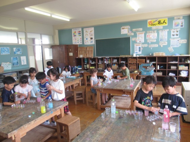 子供たちは色が変わった瞬間に、目を輝かせていました。「ジュースやさんにしよう」「このジュースをどうぞ」と友達と分け合い、楽しんでいました。