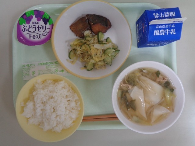 今日の献立は、ごはん、あじのみりんやき、あわせあえ、みそワンタンスープ、ぶどうゼリー、牛乳です。