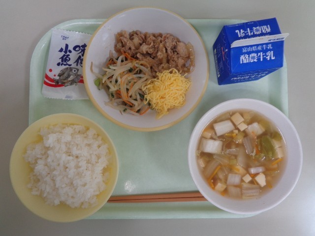 今日の献立は、ごはん、ビビンバ(焼肉、ナムル、錦糸卵)、中華スープ、味付け小魚、牛乳 です。