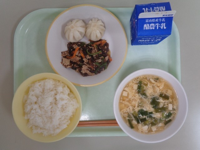 今日の献立は、ごはん、えびパオツ、もずくのチャプチェ、にらたまじる、牛乳です。
