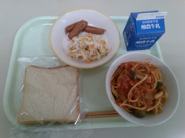 今日の献立は、減量食パン、あらびきウインナー、コールスローサラダ、ツナとトマトのスパゲッティ、牛乳 です。