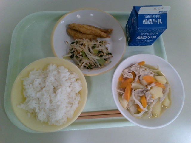 今日の献立は、ごはん、わかさぎのフリッター、いり大豆和え、塩肉じゃが、牛乳 です。
