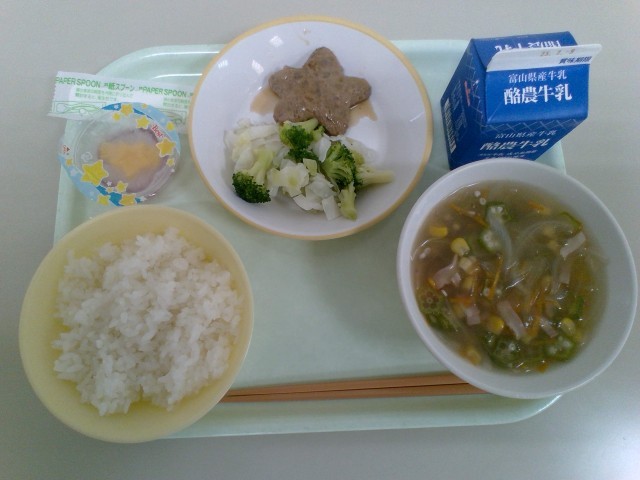 今日の献立は、ごはん、星形ハンバーグ、そえ野菜、天の川スープ、七夕ゼリー、牛乳 です。